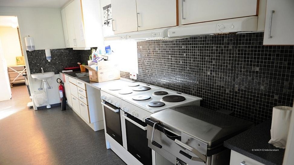 Schlafhaus: Je ein Dreibett-, Sechsbett-, Achtbett und Zwölfbettzimmer sowie Toiletten und Waschbecken.